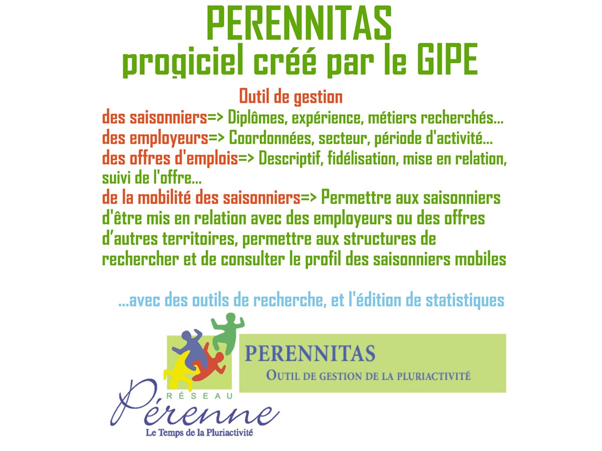 Le GIPE a développé un logiciel PERENNITAS qui permet de gérer les données relatives à la saisonnalité. Il assure un suivi des données du point de vue qualitatif et quantitatif sur un territoire donné. Cet outil possède un certain nombre de fonctionnalités adaptées au montage de parcours pluriactifs.