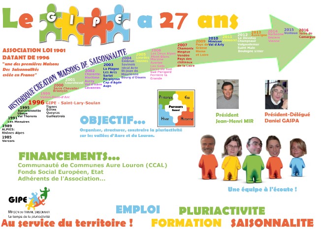 Première Maison de la saisonnalité qui a vu le jour dans les Pyrénées, l’association « Construire la Pluriactivité » dénommée GIPE (Guichet Initiative Pluriactivité Emploi) a été créée le 5 juin 1996, à l’initiative du Maire de Saint-Lary-Soulan, Jean-Henri MIR, dans le prolongement d’études et d’actions de mobilisation des acteurs locaux.